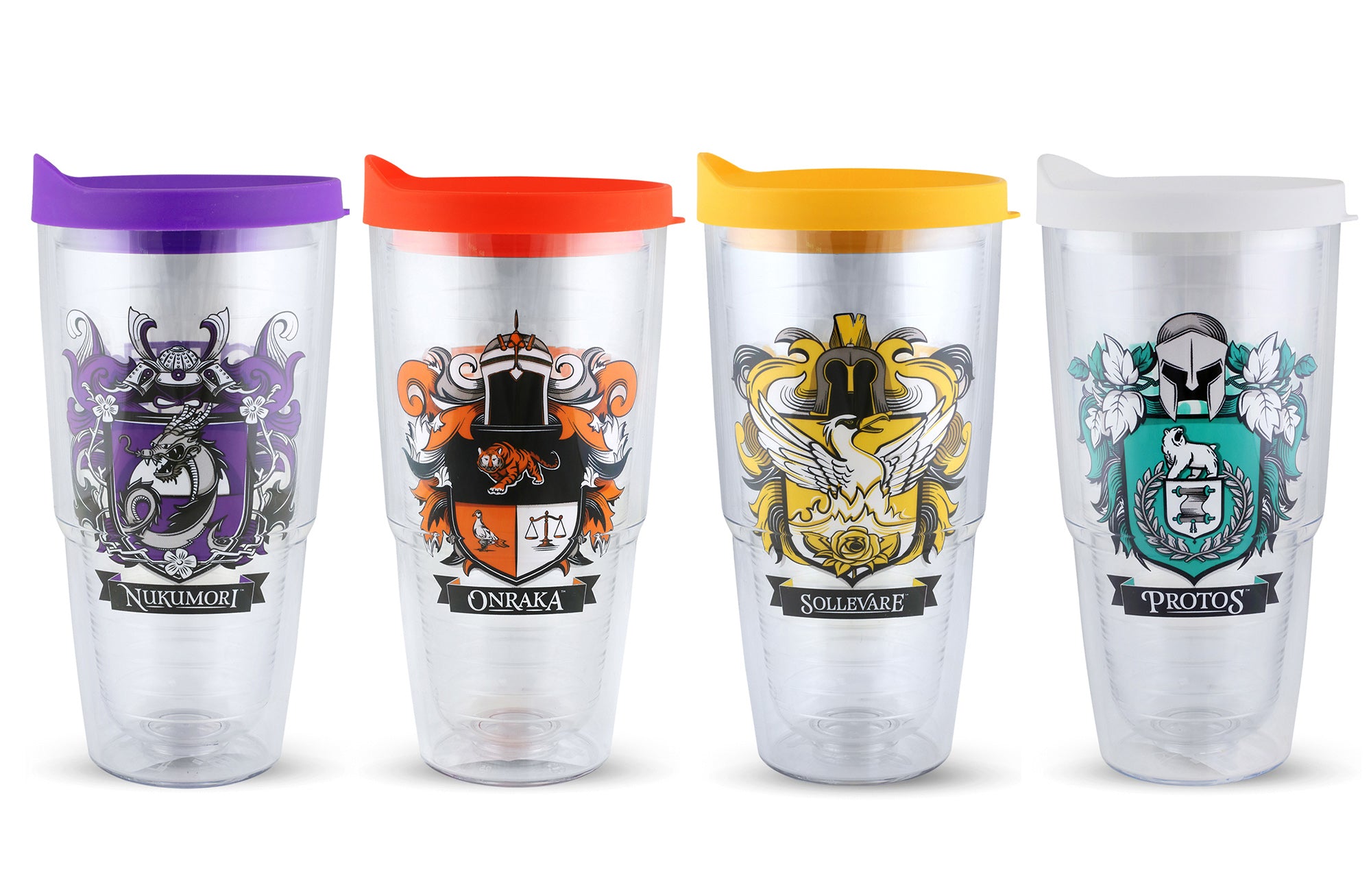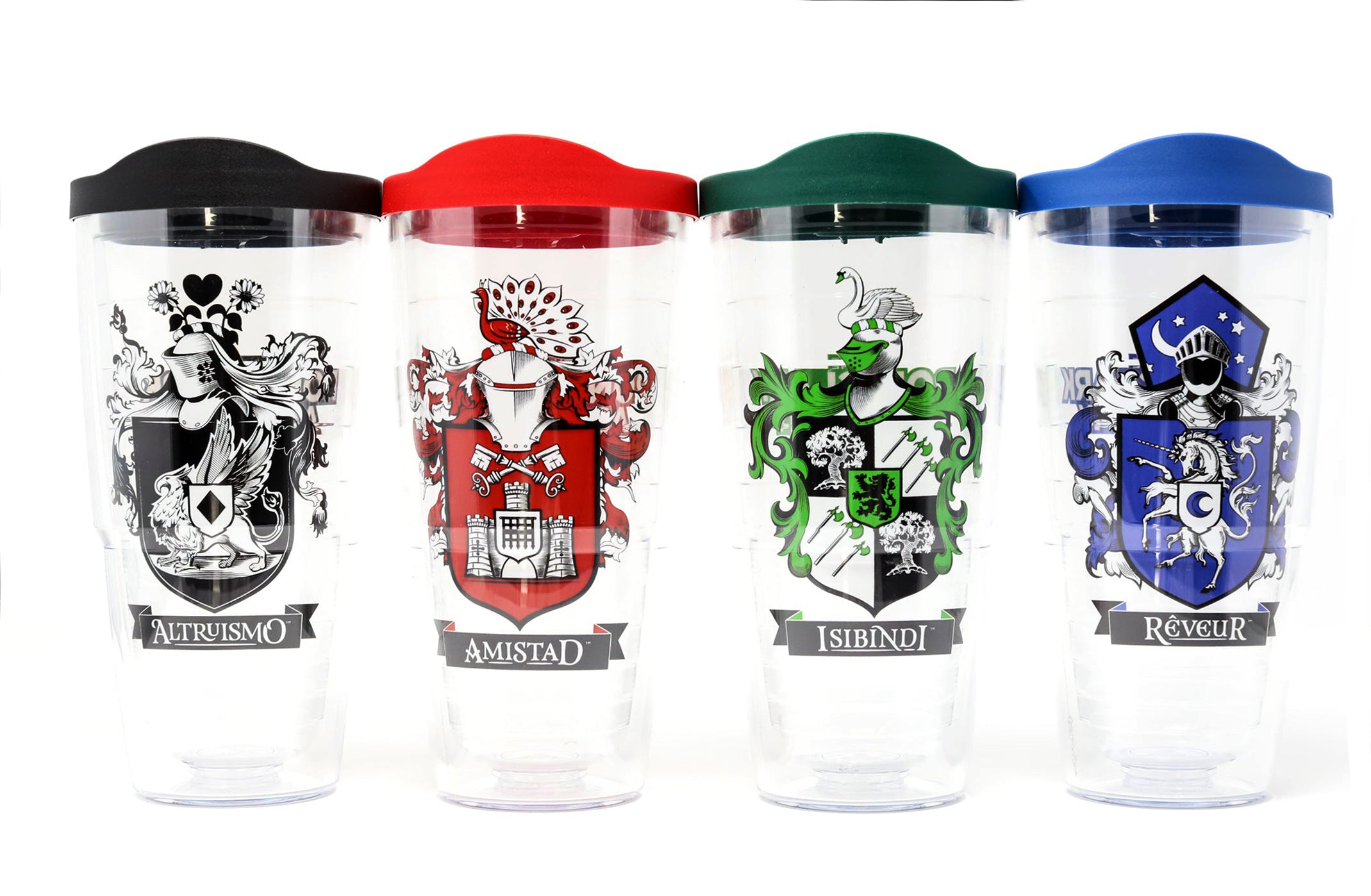 24 oz tumbler comes with a lid. Available in all four house colors. Each sold separately.